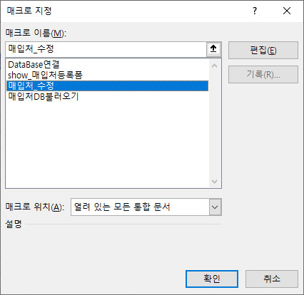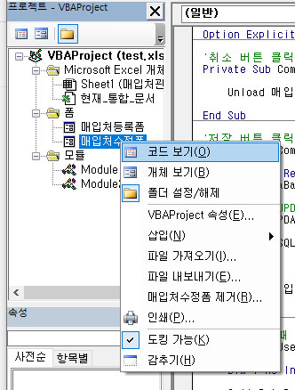 마지막으로 매입처수정폼의 코드보기로 유저폼내의 처리를 해줄 프로시저를 만들어 줍니다.