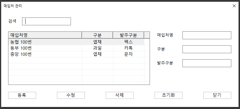 매입처 관리폼은 이걸로 마무리가 되었습니다.