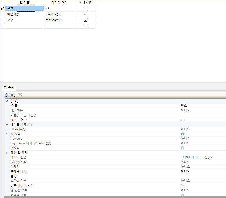 매입처명과 구분은 nvarchar로 설정해주세요.