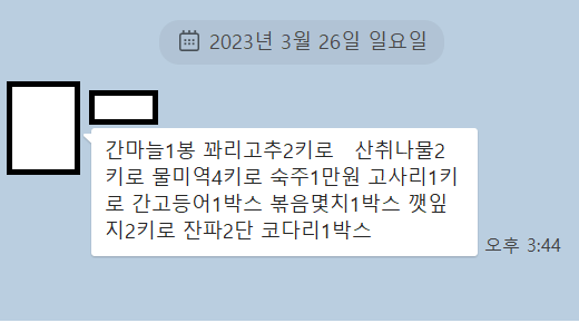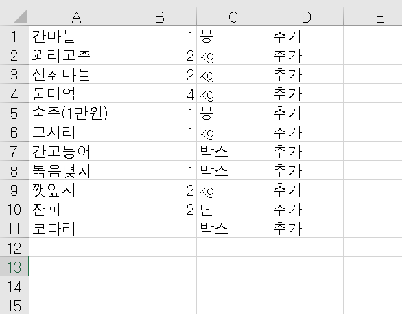 가져온 대화 내용을 빈칸(스페이스)를 기준으로 구분해서 품명, 수량, 단위를 구분하여 A1셀부터 입력하는 코드입니다.