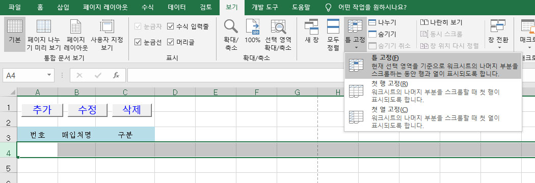 틀고정은 굳이 안해도 상관은 없지만 매입처수가 많아지면 틀고정을 하는게 보기&관리하기 편합니다.
