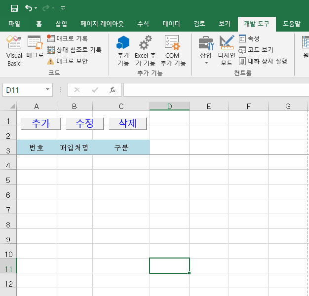 이전시간에 DB에 매입처 테이블을 만들었으니 이제 매입처 테이블을 제어할 엑셀 시트를 만들겠습니다.